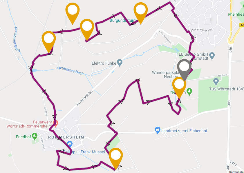 Since the trail is circular you can start it at any point like the center of Rommersheim or the town exit Wรถrrstadt just above the Neubornbad outdoor swimming pool. However parking is easiest in the Neuborn recreational area since there is a proper and free (at time of writing) parking lot. You can reach the car park coming from the Autobahn: